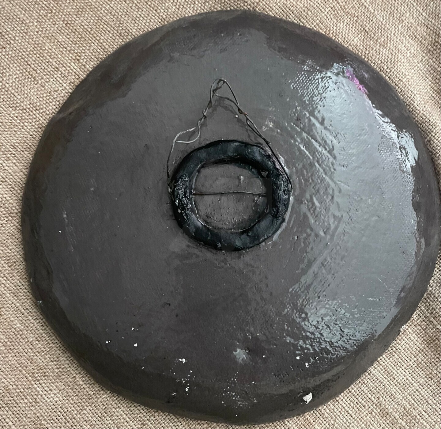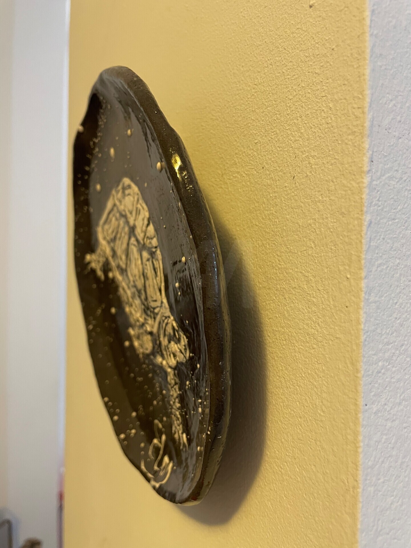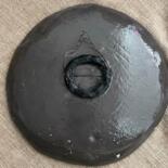 Handmade decorative wall plate crafted from black clay with underglaze slip painting.
