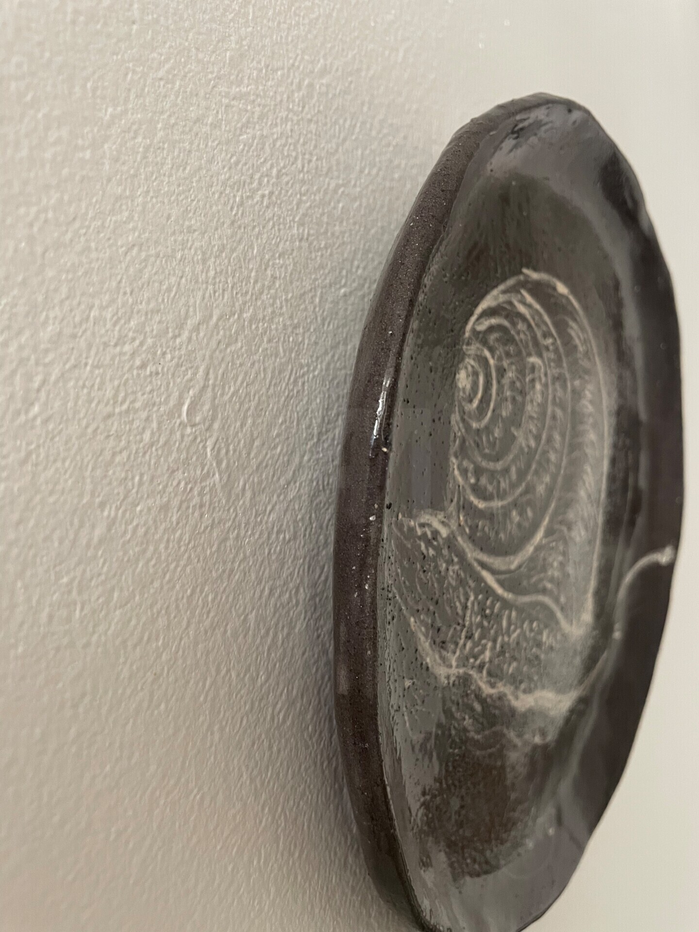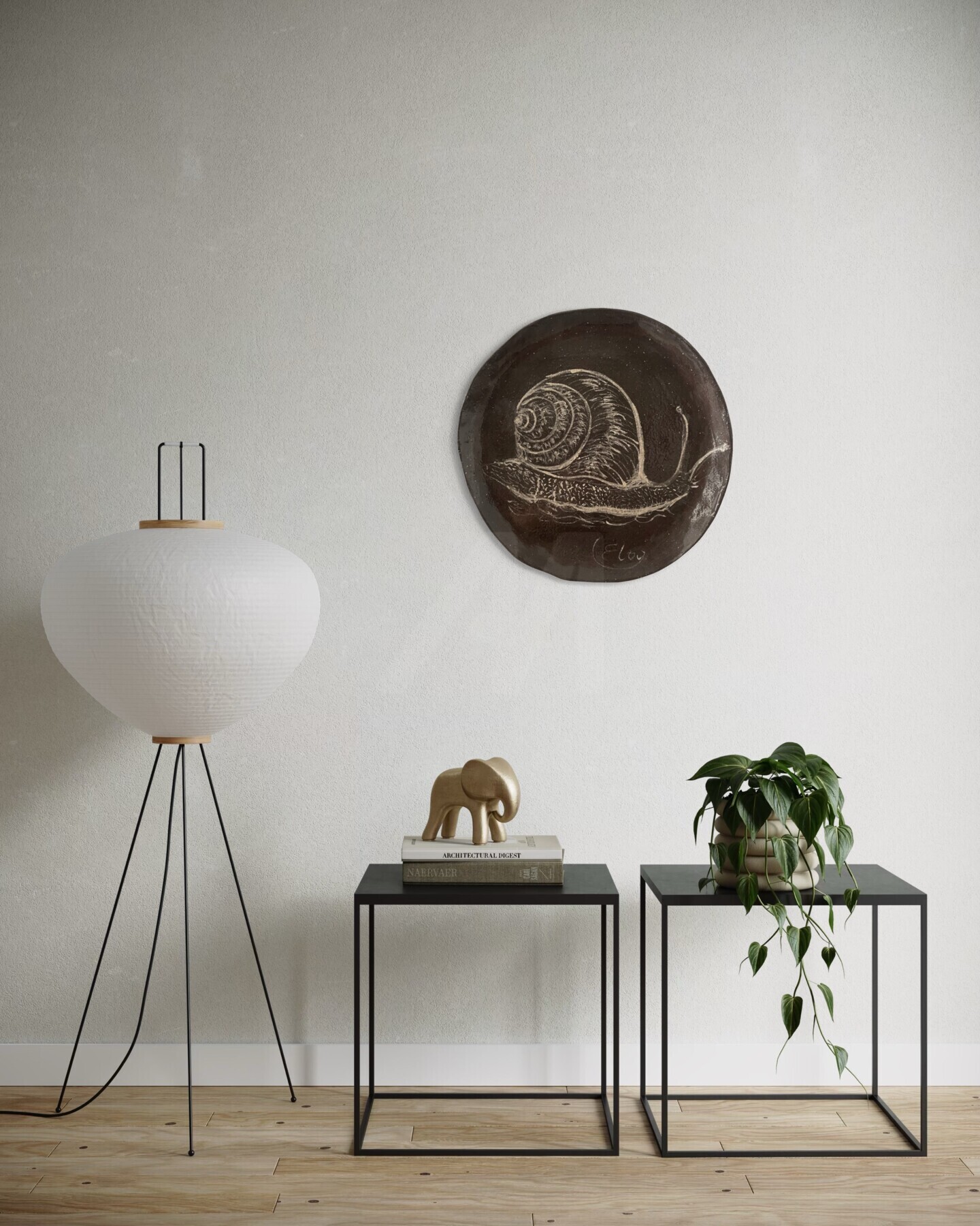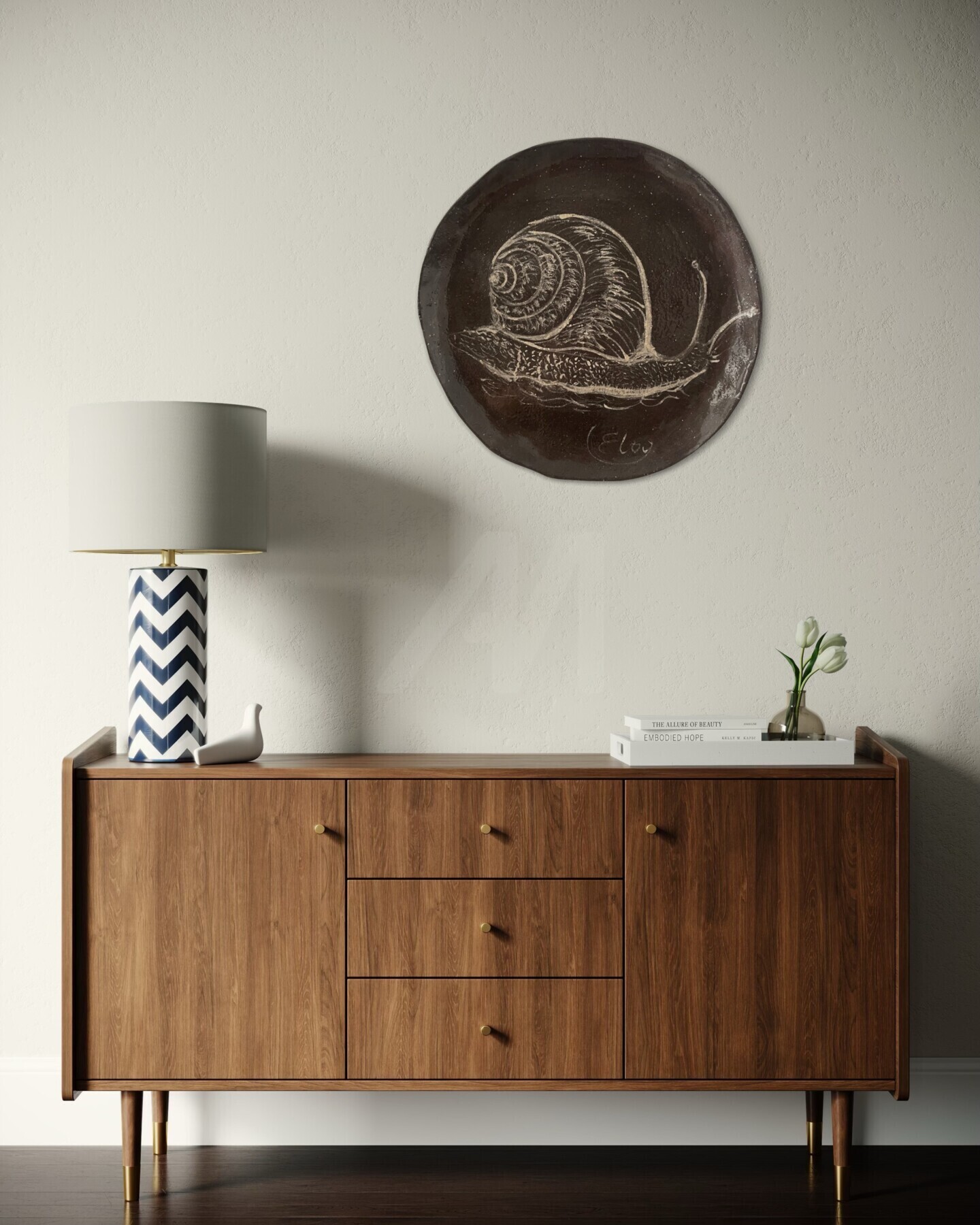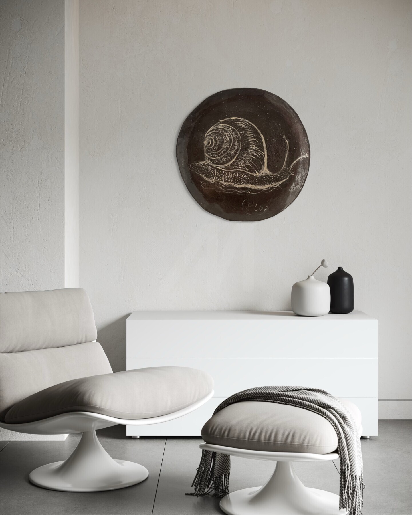 Handmade wall plate from black ceramic clay featuring a snail. Underglaze engobe painting highlights the spiral shell and gentle movement. Double firing ensures durability and richness of texture. A symbol of the slow but steady path, reminding us of the strength in silence and patience.