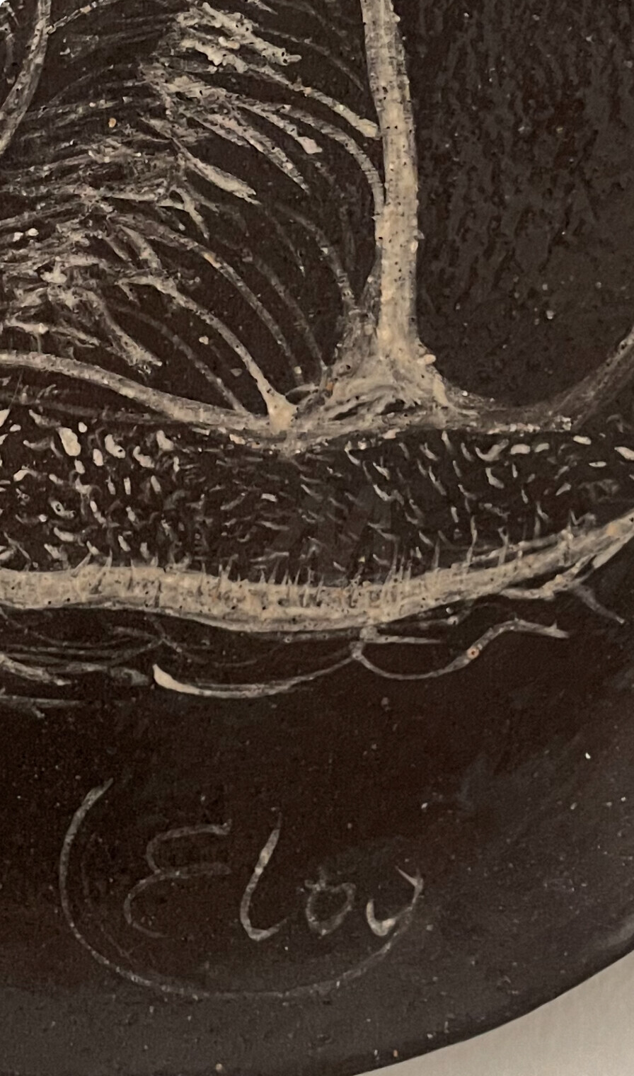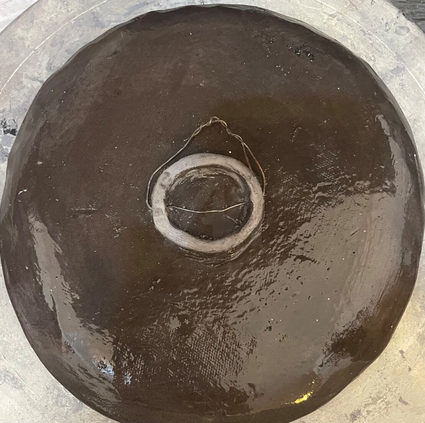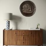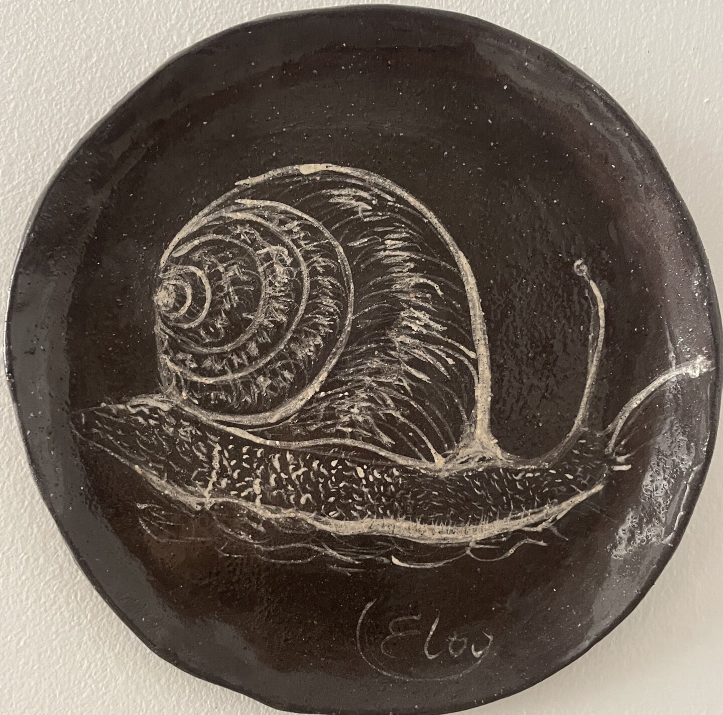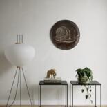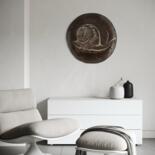 Handmade wall plate from black ceramic clay featuring a snail. Underglaze engobe painting highlights the spiral shell and gentle movement. Double firing ensures durability and richness of texture. A symbol of the slow but steady path, reminding us of the strength in silence and patience.