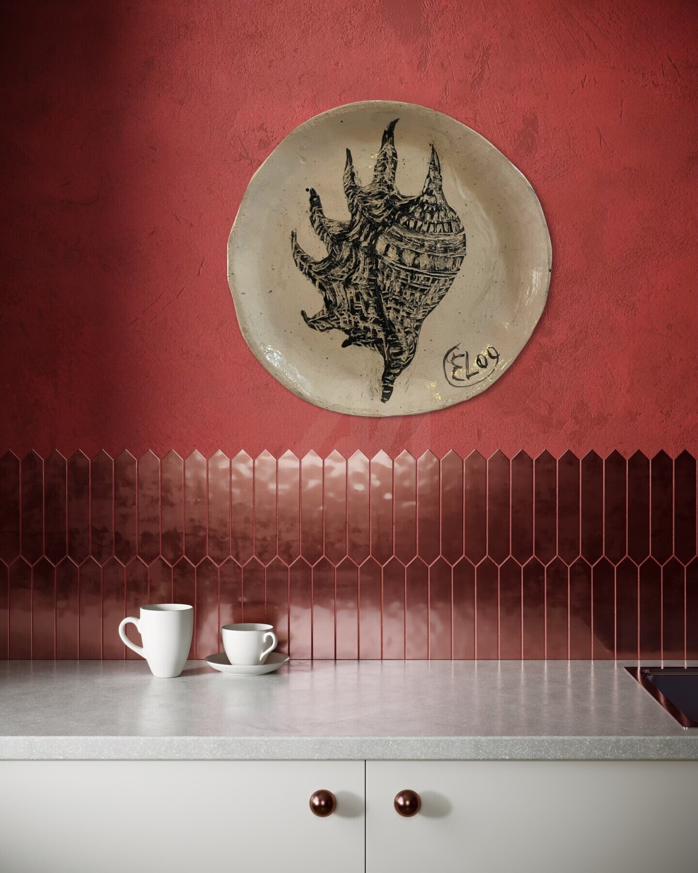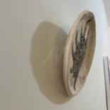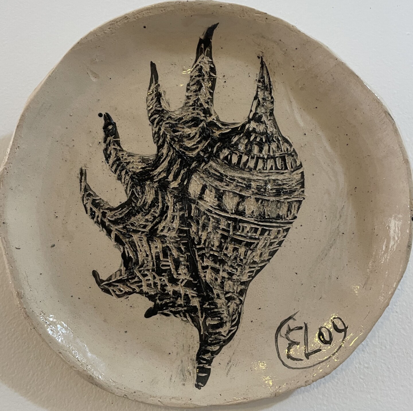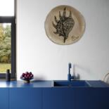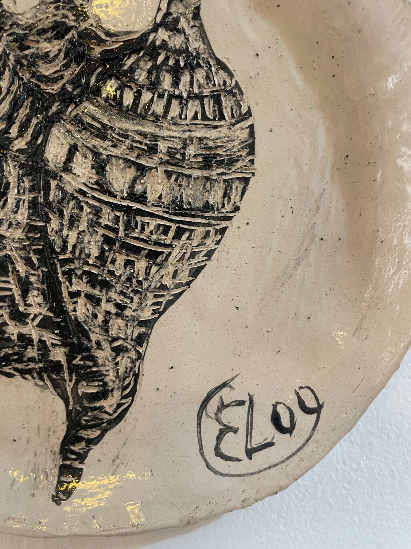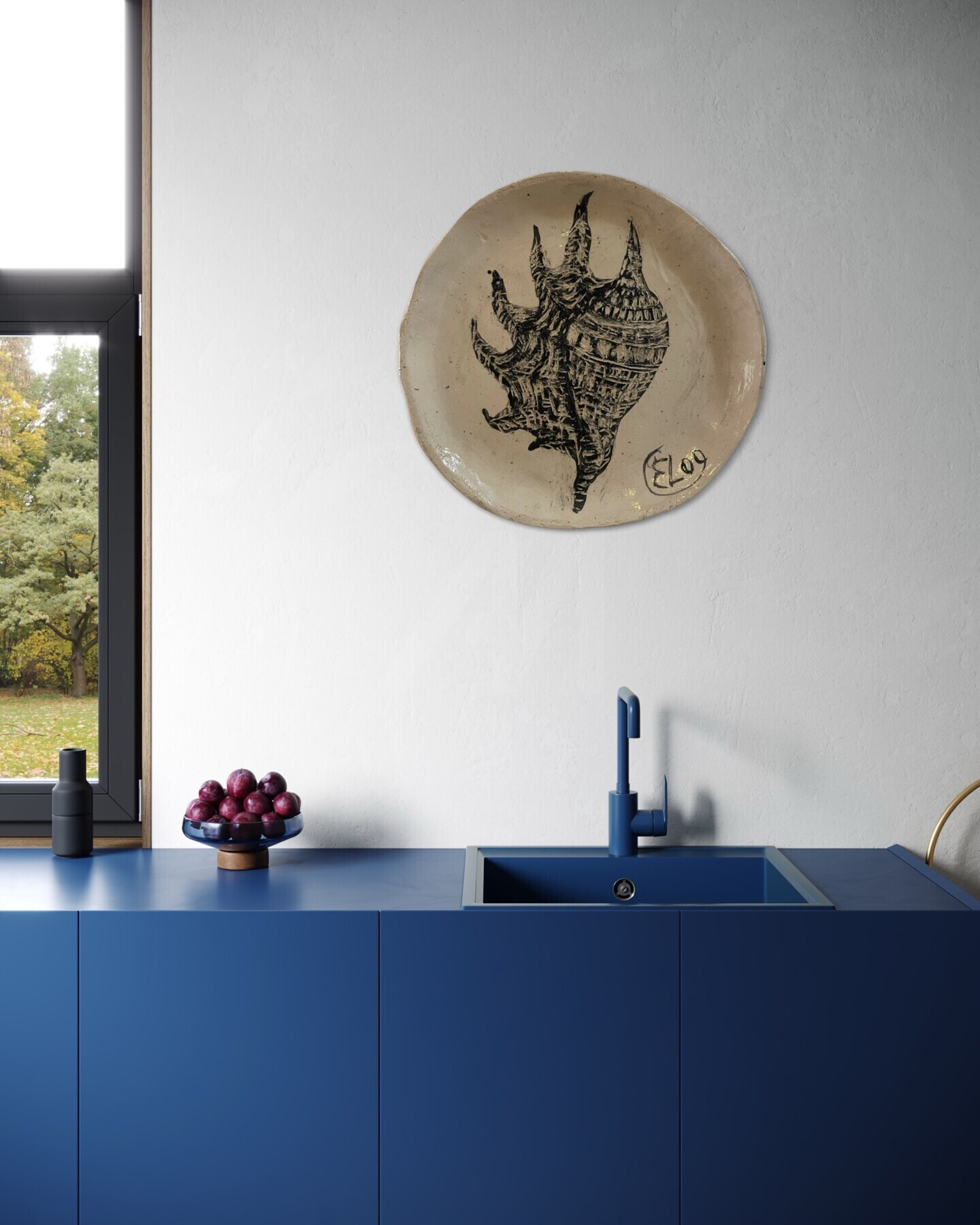 This ceramic wall plate is crafted from natural clay and went through a double firing process for durability. The central motif is a seashell, painted with underglaze slip (engobes) in a fine graphic style.