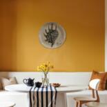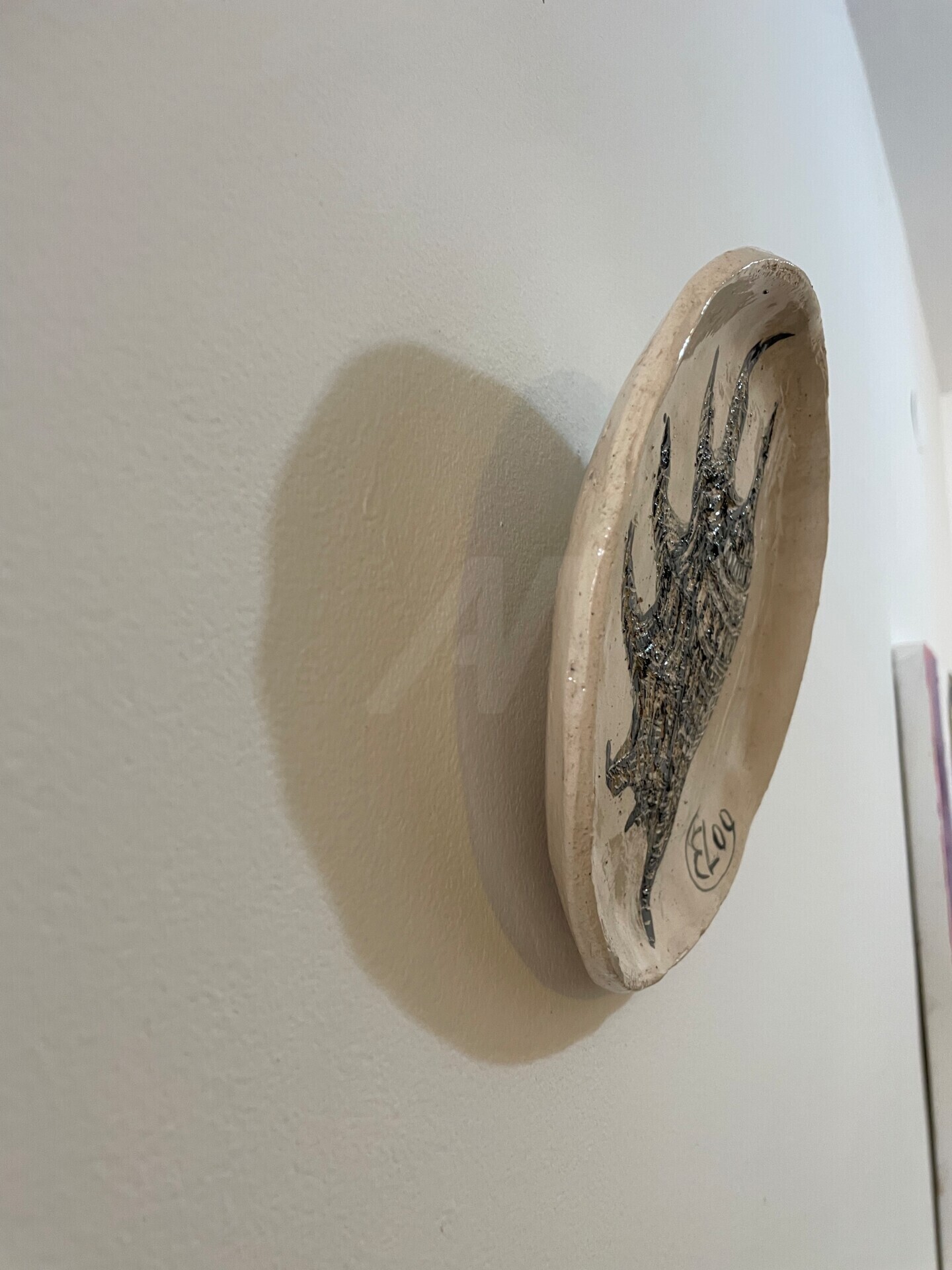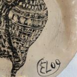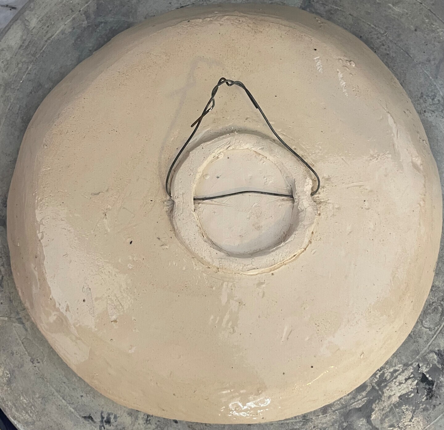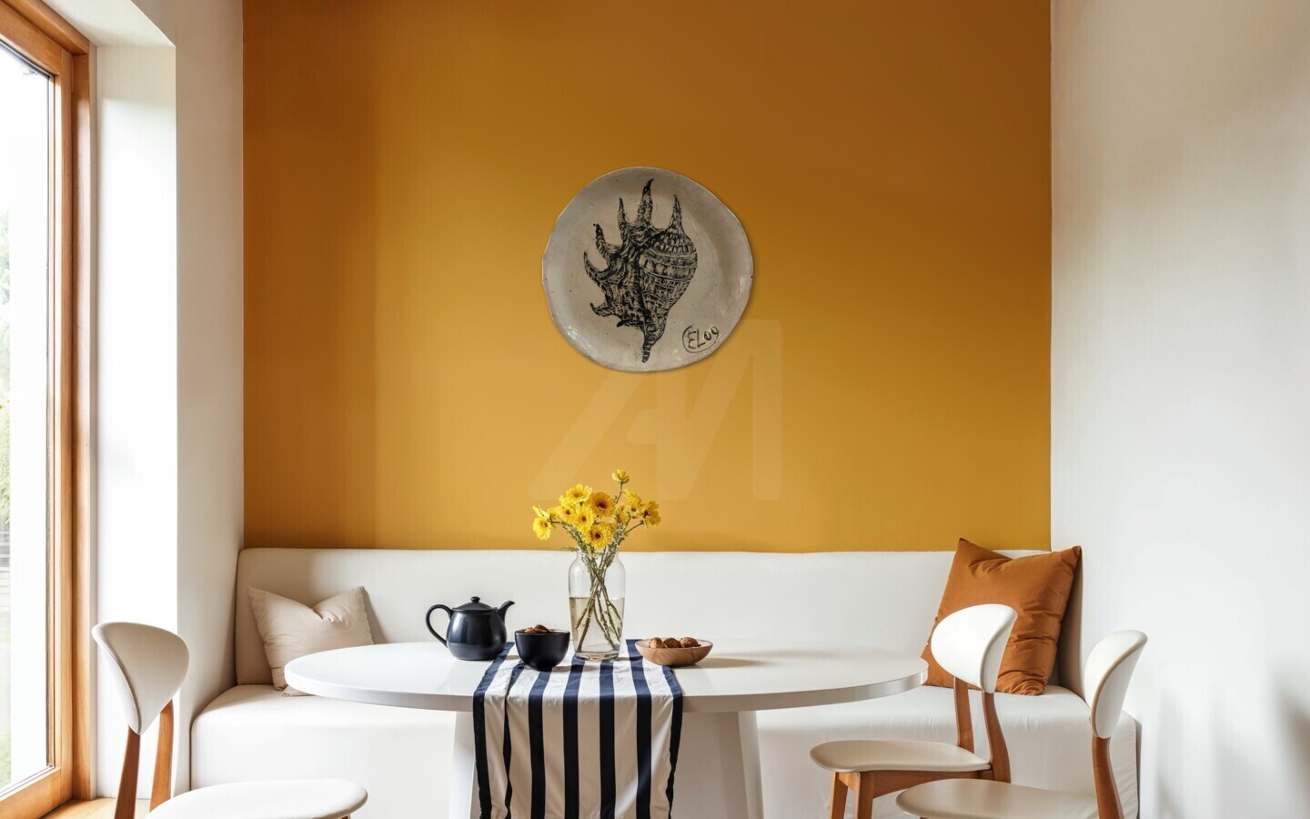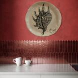 This ceramic wall plate is crafted from natural clay and went through a double firing process for durability. The central motif is a seashell, painted with underglaze slip (engobes) in a fine graphic style.
